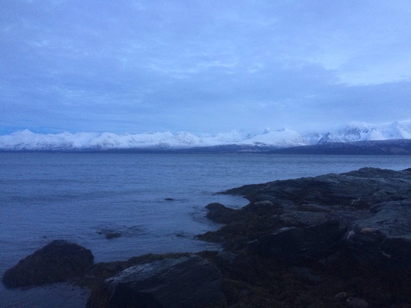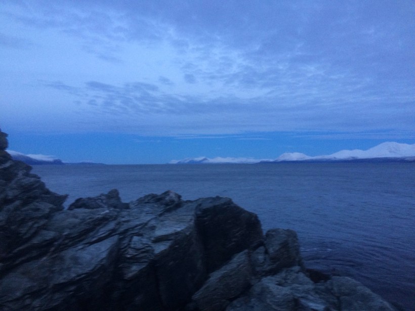 But Ulstinden is a huge mountain, and darkness falls quickly in the Arctic. By 3 in the afternoon we were trying to climb over slippery rocks and cross creeks in the pitch black. there are no trails, and no roads, and no lights anywhere near. We had a head lamp, but it almost made trying to navigate the wet rocks even more difficult. We constantly had to trek into the forest to get around the places where the rock had crumbled into the ocean, and the forest was dark and wet.