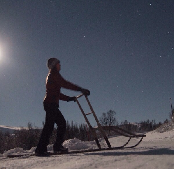 Its a little wooden sled, with metal runners. You stand on the runners and then kick off with one foot. Its fun because we take turns sitting on the sled. I should mention that the light in this picture is actually the moon, I havent seen the sun in a month an a half.